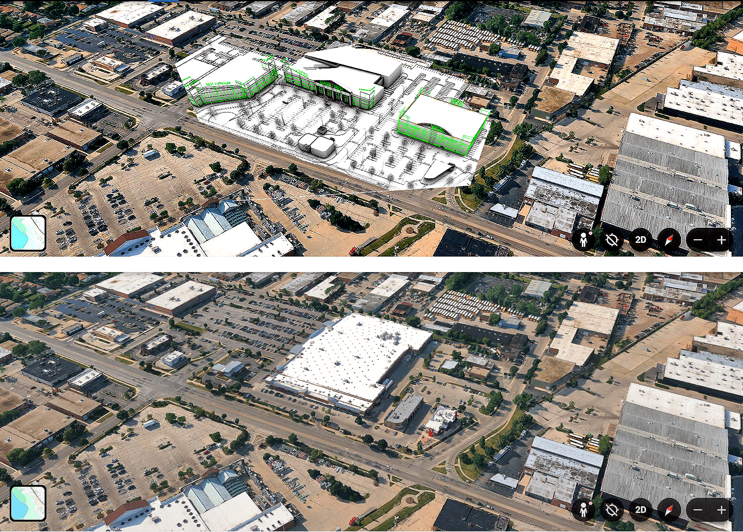 Regional Shoppng Center | Brownfield | Chicago | Joint Venture Philip R Cohen AIA Architect, Chicago | As Proposed, Top, 2008-9; As Built, Lower, 2010