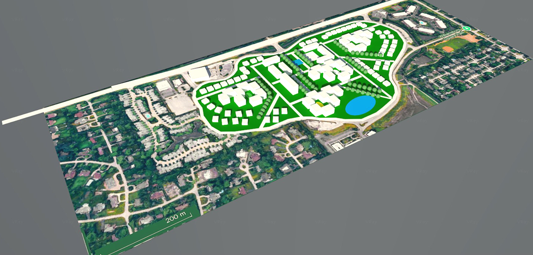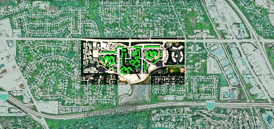 VII__Regional Urban Design_Northbrook Court Illinois Mixed Use MasterPlan_2026 Four Midrise Senior 5 Story Courtyard Groupings Designed for Social Scale + Community in combination with Lowrise Shopping and Detached Townhomes. 2026. CFS Prefab Panelized. Design Development.